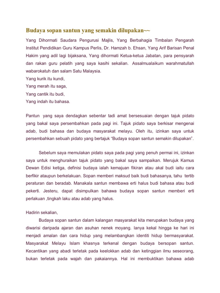 Menunjukkan satu sikap yang mesra dan bersopan-santun semasa menjalankan tugas. Amalan beradab dan bersopan santun haruslah dipupuk dalam kalangan kanak-kanak supaya mereka menjadi anak muda yang disegani dan berguna kepada bangsa dan. You can also bookmark this page with the url.
